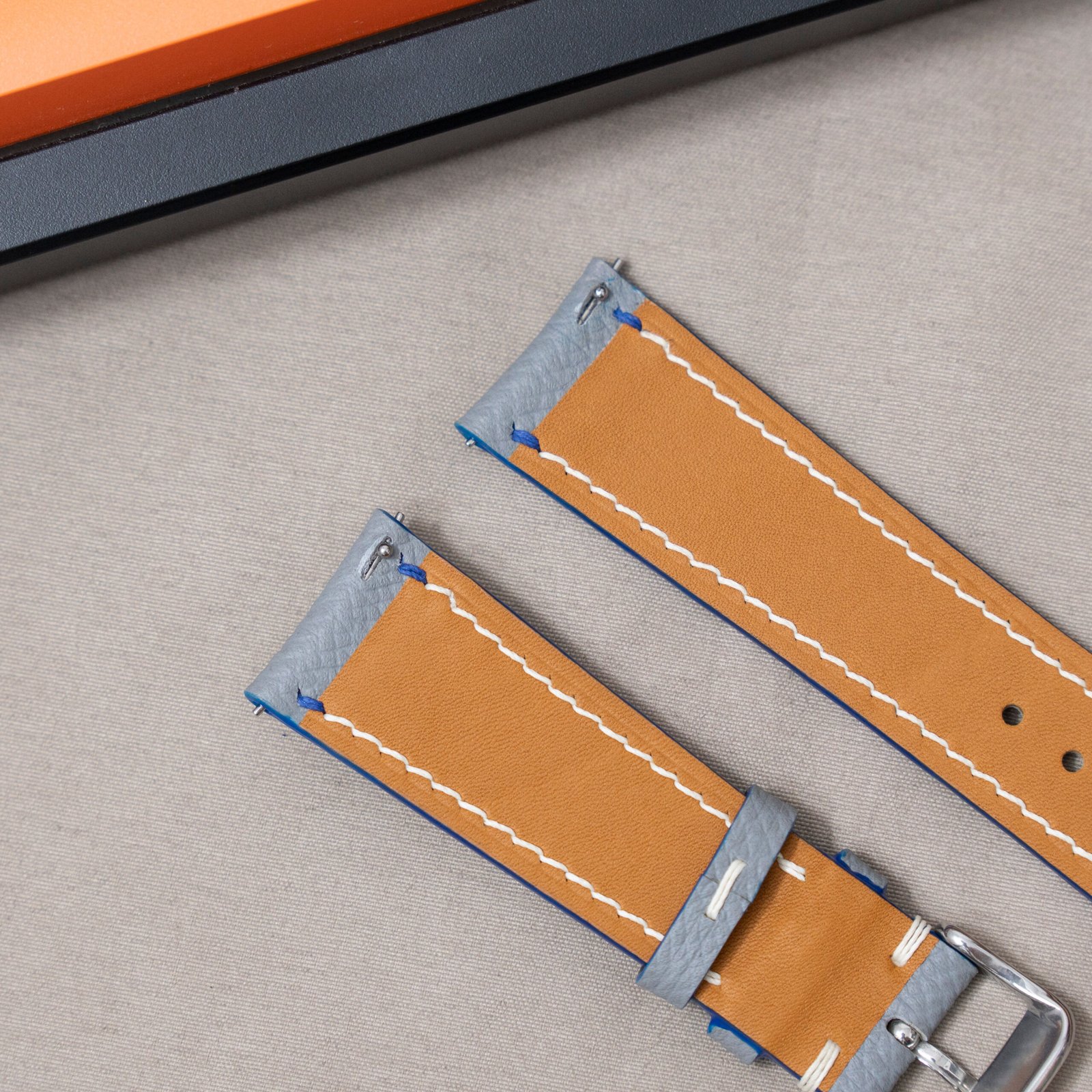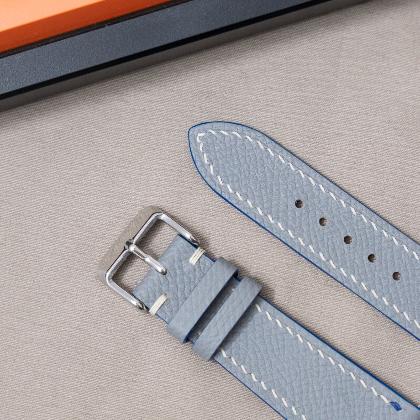 This is a MTO strap for Grand Seiko Taisetsu with Grey Epsom leather color and blue highlight stitching on top – white stitching for the rest. Also curved end quick release lugs instead of normal straight lugs. You can get this or modify it to compatible with your watch.