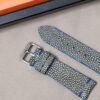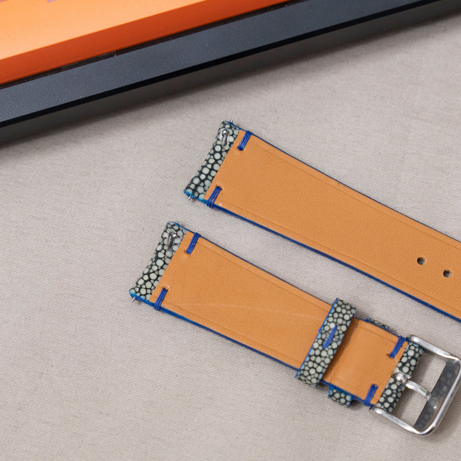 This is a MTO strap for Grand Seiko Taisetsu with Grey Stingray leather color and blue highlight stitching on top – white stitching for the rest. Also curved end quick release lugs instead of normal straight lugs. You can get this or modify it to compatible with your watch.